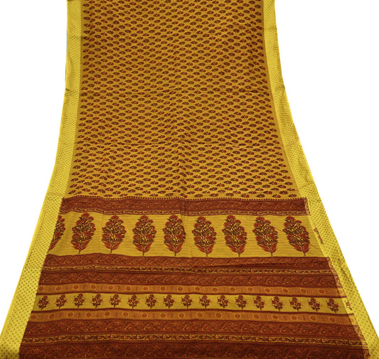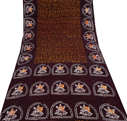 Indian Vintage Saffron & Brown Saree Batik Printed 100% Pure Cotton Sari Craft Fabric Soft 5Yd Sewing Sarong Wrap Boho Dress Making Upcycle