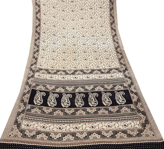 Indian Vintage Saree Beige & Black Moss Crepe Printed Sari | 5 Yards | Floral Soft Fabric for Sewing, Dressmaking, Crafting, Quilting