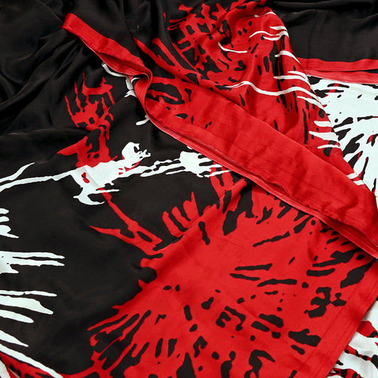 Indian Vintage Saree Black & Ivory Moss Crepe Printed Sari 5yd Sewing Floral Soft Craft Fabric Dressmaking Quilting For Crafting Upcycle