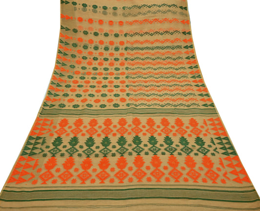 Indian Vintage Sarees Beige Pure Cotton Hand Woven Jamdani Sari 5yd Ethnic Floral Craft Fabric Dress making Upcycle Crafting Quilting
