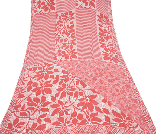 Indian Vintage Saree Red & Ivory Moss Crepe Printed Sari | 5 Yards | Floral Soft Fabric for Sewing, Dressmaking, Crafting, Quilting