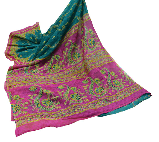 Indian Vintage Sari Green & Blue 100% Pure Silk Printed Sarees Woven Sari 5yd Sewing Craft Fabric Dress Making Soft Zari Border