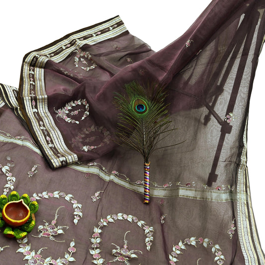 Indian Vintage Sarees Purple Pure Organza Silk Hand Woven/Painted Sari 5yd Ethnic Floral Craft Fabric Dress making Upcycle Crafting Zari