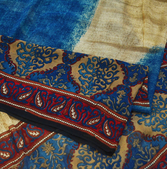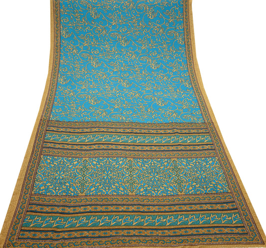 Indian Vintage Sari Beige & Blue Pure Silk Printed Sarees Craft Fabric 6yd Sewing Dress Making Soft Floral Crafting Quilting Upcycle