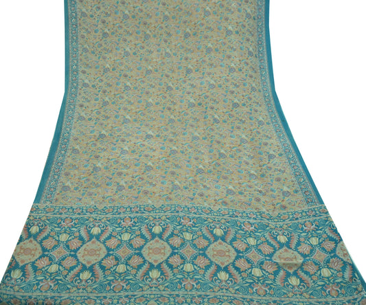 Indian Vintage Sari Beige & Blue Pure Georgette Silk Saree Craft Fabric Sewing 6Yard Soft Light Dress Making Floral