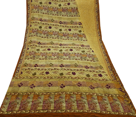Indian Vintage Sari Beige & Brown Pure Crepe Silk Hand Embroidered Kantha Saree Craft Fabric 5yd Sewing Floral Soft Dress making Crafting