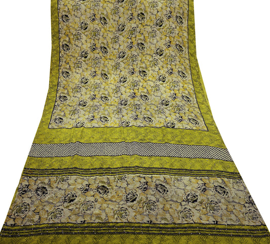 Indian Vintage Sari Beige & Green Pure Crepe Silk Printed Sarees 5yd Sewing Soft Craft Fabric Wrap Paisley Crafting Dress making Quilting