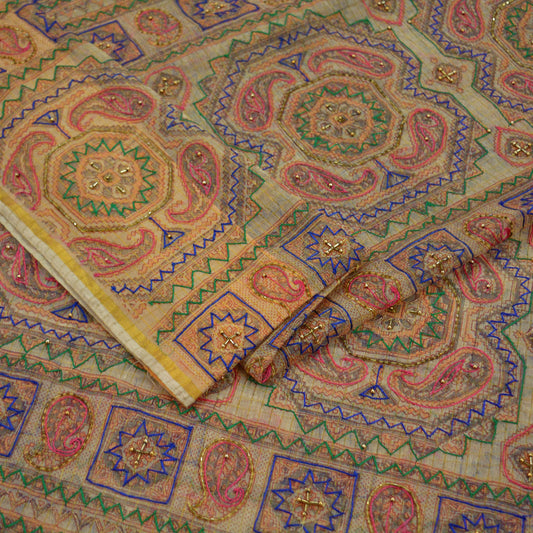 Indian Vintage Sari Beige Artificial Silk Hand Embroidered Sarees Craft Fabric 5yd Sewing Soft Dress Making Crafting Upcycle Quilting