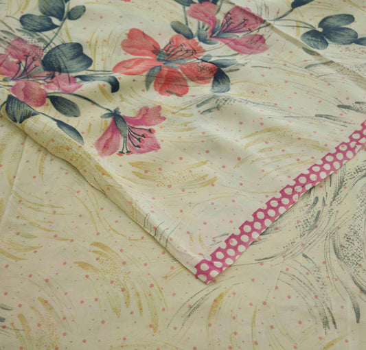 Indian Vintage Sari Beige 100% Pure Silk Printed Saree 5rd Sewing Craft Fabric DressMaking Soft Floral