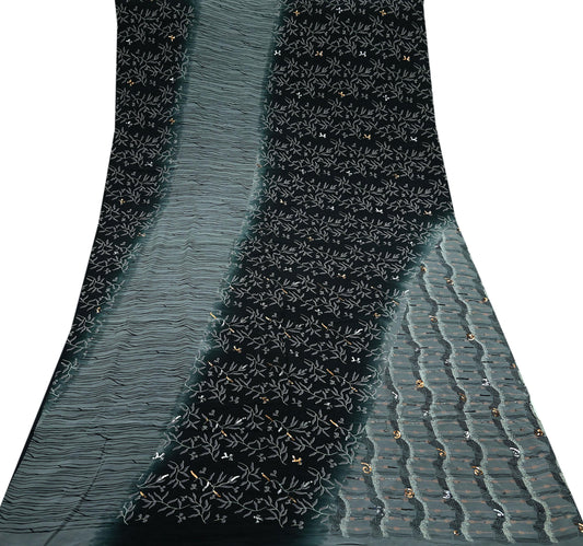 Indian Vintage Sari Black & Gray Pure Crepe Silk Hand Embroidered Saree 5yd Sewing Floral Craft Sequins Dress making Crafting Quilting