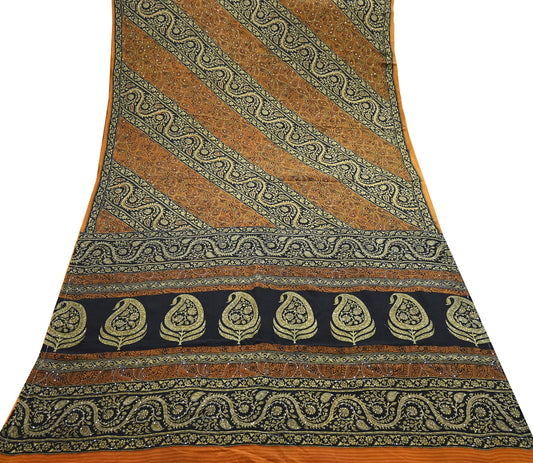 Indian Vintage Sari Black & Orange Printed Pure Cotton Saree Craft Fabric Soft Floral 5Yd Sarong Wrap Boho Kimono Soft Dress making Quilting