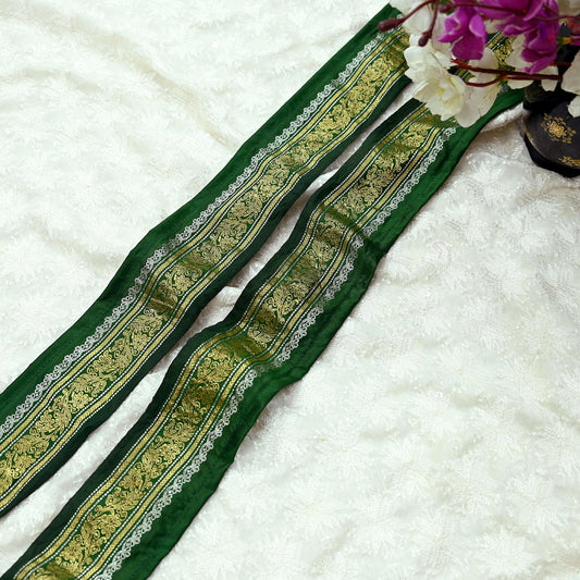 Indian Vintage Sari Border Green Woven Banarasi Brocade Trim Craft Sewing Recycled Sari Border Golden Zari Pure Silk Home Decor Crafting