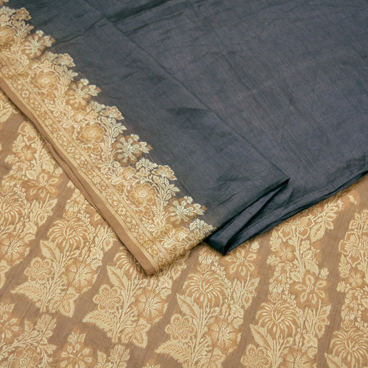 Indian Vintage Sari Brown & Black Pure Tussar Silk Hand Woven Sarees Craft Fabric 5Yd Sewing Ethnic Dress making Quilting Crafting Upcycle