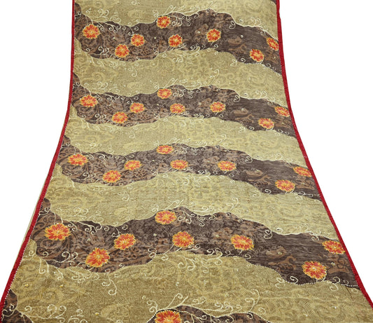 Indian Vintage Sari Brown & Beige Pure Crepe Silk Hand Embroidered Saree 5yd Sewing Floral Craft Sequins Dress making Crafting Quilting
