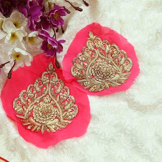 Indian Vintage Pink Pure Georgette Silk Appliques Set of 2 | Hand-Embroidered Floral Patches with Zardozi, Dabka, Zari,for Craft, Journals
