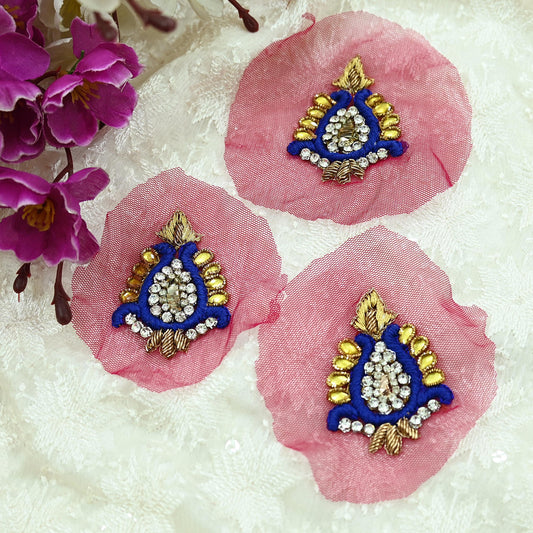 Indian Vintage Pink Net Hand-Embroidered Appliques Set of 3, Zardozi, Dabka, Mukesh, Bead Work | Floral Patches for Crafts, Journals
