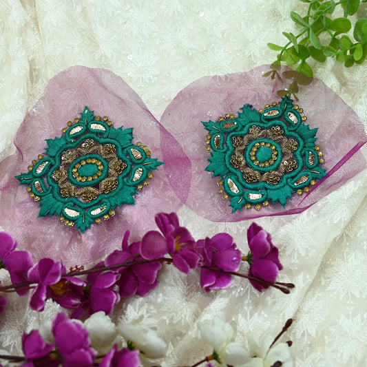 Indian Vintage Green Net Hand-Embroidered Appliques Set of 2 I Zardozi, Dabka, Mukesh, Bead Work | Floral Patches for Crafts, Journals