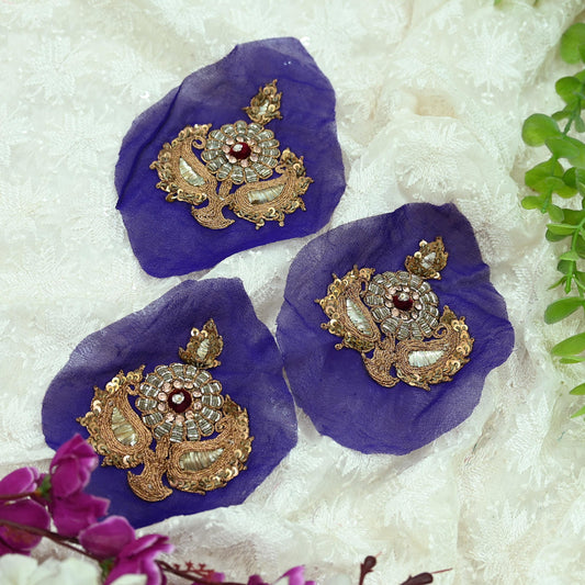 Indian Vintage Purple Pure Georgette Silk Appliques Set of 3 | Hand-Embroidered Floral Patches with Zardozi, Dabka ,for Craft, Journals