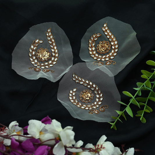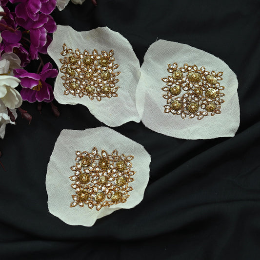 Indian Vintage Ivory Pure Georgette Silk Appliques Set of 3 | Hand-Embroidered Floral Patches with Zardozi, Dabka, for Craft, Journals
