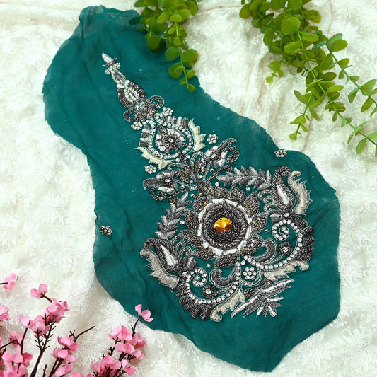 Indian Vintage Green Pure Georgette Silk Appliques Set of 1 | Hand-Embroidered Floral Patches with Zardozi, Dabka, for Craft, Journals