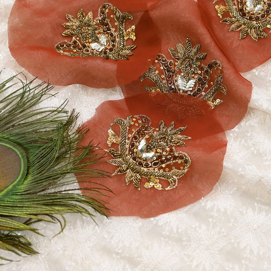 Indian Vintage Hand-Embroidered Rusty Pure Georgette Silk Appliques Set of 5 Floral Patches with Zardozi, Dabka, Zari,for Craft, Journals