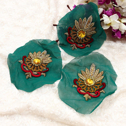 Indian Vintage Hand-Embroidered Green Pure Georgette Silk Appliques Set of 3 Floral Patches with Zardozi, Dabka ,for Craft, Journals