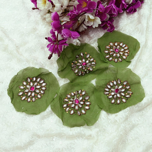 Indian Vintage Hand-Embroidered Green Pure Georgette Silk Appliques Set of 5 Floral Patches with Zardozi, Dabka, for Craft, Journals