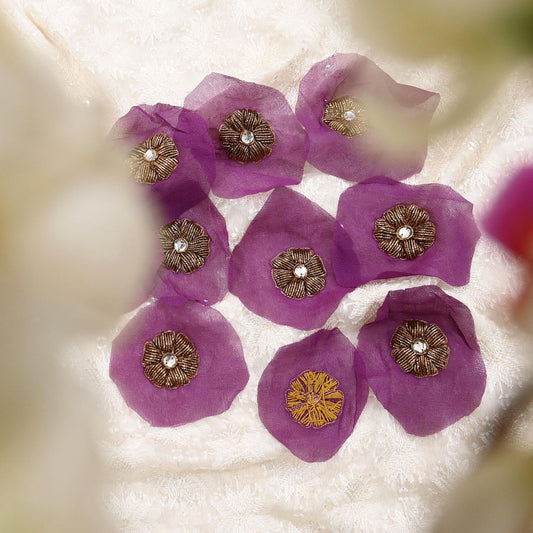 Indian Vintage Hand-Embroidered Purple Pure Georgette Silk Appliques Set of 10 Floral Patches with Zardozi, Dabka, for Craft, Journals
