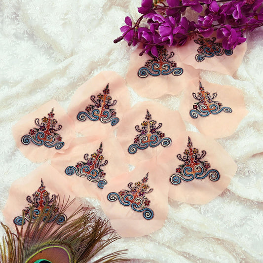 Indian Vintage Hand-Embroidered Peach Pure Georgette Silk Appliques Set of 10 Floral Patches with Zardozi, Dabka ,for Craft, Journals