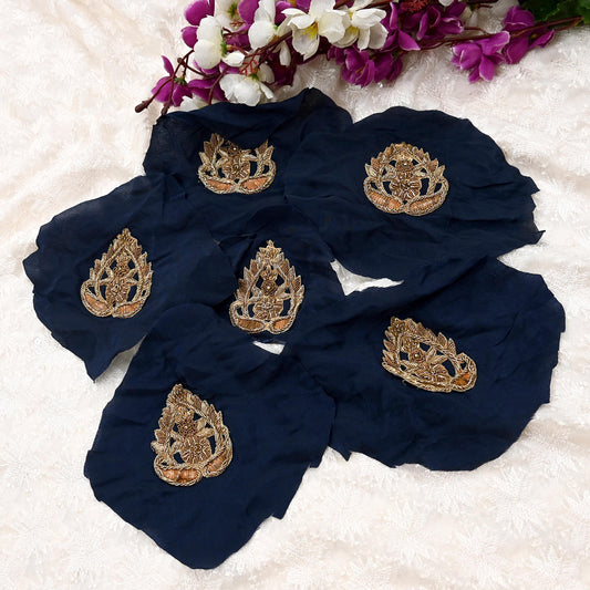 Indian Vintage Blue Pure Crepe Silk Appliques Set of 6 | Hand-Embroidered Floral Patches with Zardozi, Dabka, Zari,for Craft, Journals