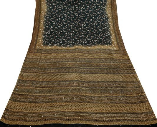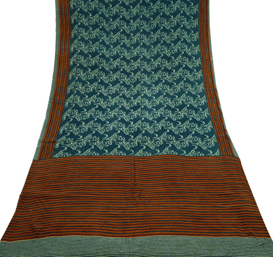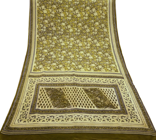 Indian Vintage Sari Green & Brown Pure Crepe Silk Printed Saree 5yd Sewing Floral Soft Craft Fabric Wrap Dress making Crafting Quilting