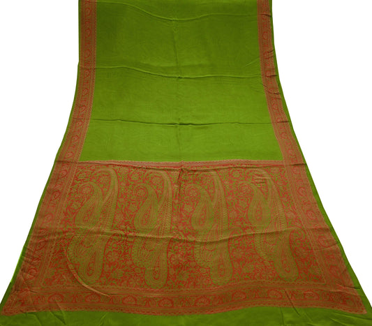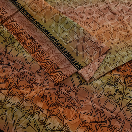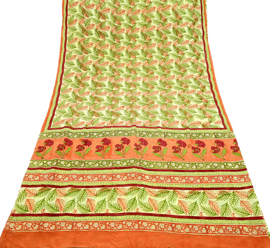 Indian Vintage Sari Green & Orange Pure Crepe Silk Block Printed Sarees 5yd Sewing Soft Craft Fabric Wrap Dress making Crafting Quilting