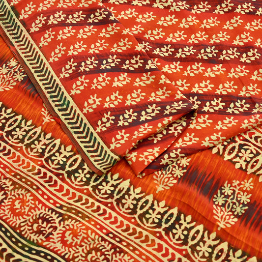 Indian Vintage Sari Orange Pure Crepe Silk Block Printed Sarees 5yd Sewing Floral Craft Fabric Wrap Dress Making Crafting Quilting Upcycle