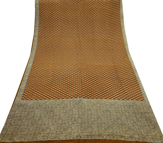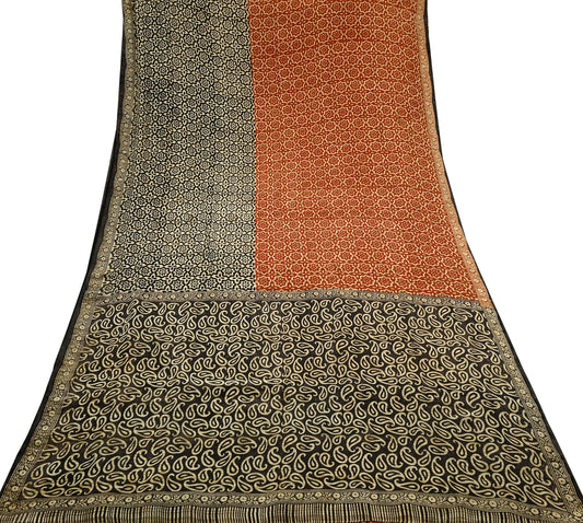 Indian Vintage Sari Brown & Orange Pure Crepe Silk Block Printed Sarees 5yd Sewing Soft Craft Fabric Wrap Dress making Crafting Quilting