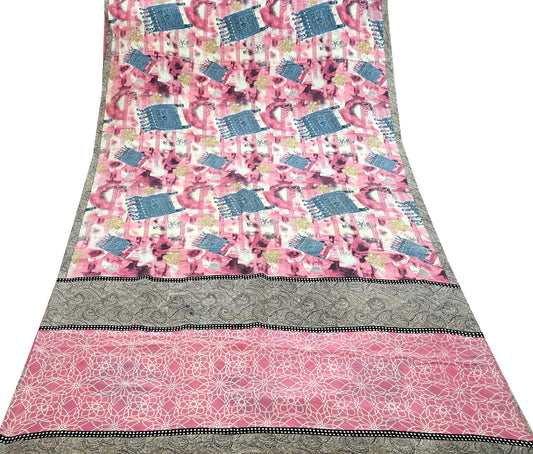Indian Vintage Pink & Ivory Saree Pure Crepe Silk Printed Sari Craft Fabric 5yd Sewing Soft Wrap Crafting Quilting Dress making Upcycle