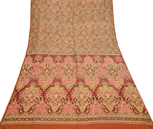 Indian Vintage Peach & Red Pure Silk Printed Saree 5 Yards Soft Floral Fabric for Dressmaking, Quilting, Crafting, Sewing Upcycling