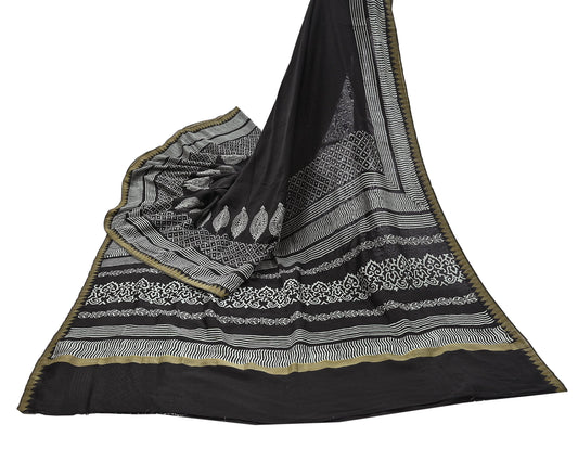 Indian Vintage Black Block Printed Pure Chanderi Silk Saree Floral woven Border 5 Yards Soft Craft Fabric for Upcycling, Dressmaking,