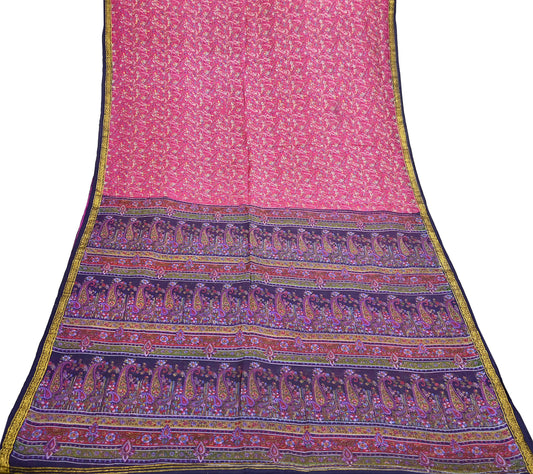 Vintage Blue & pink Pure Silk Saree Indian Printed Silk Fabric 5 Yards Boho Craft Material for Sewing, Quilting, Dressmaking, Upcycling