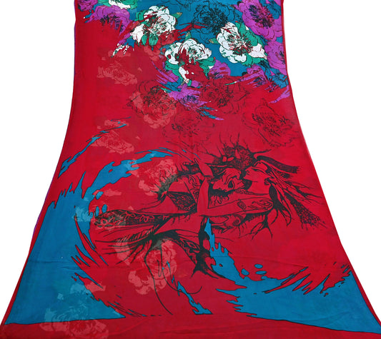 Indian Vintage Saree Red & Blue 100% Pure Georgette Silk Printed Sari Sewing 5yd Craft Fabric Soft Floral Dress Designing for Crafting