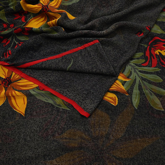 Vintage Saree Black Pure Chiffon Silk Printed Sari Craft Fabric Sewing 5Yard Soft