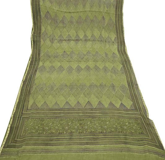 Indian Vintage Sari Green & Black chanderi Silk Bagru Printed Saree 5Yd Fabric Floral Soft Zari Border Ethnic Upcycle Crafting Dress making