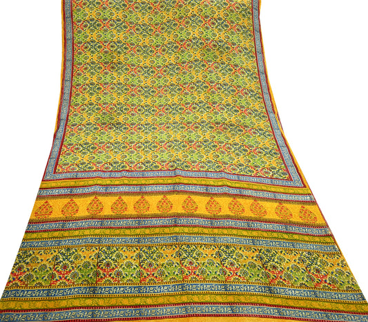 Vintage Sari Yellow Pure Silk Hand Woven Printed Saree Fabric 5yard Sewing Dress Designing for Crafting Quilting Upcycle Soft Border