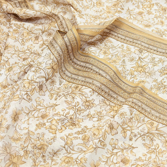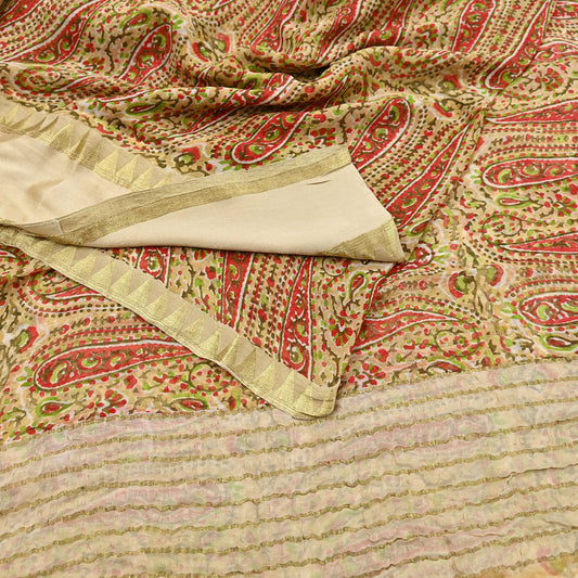 Women Vintage Sari Beige Pure Chiffon Silk Printed Saree Craft Fabric Sewing 5Yard Soft Light Dress Making Floral Zari