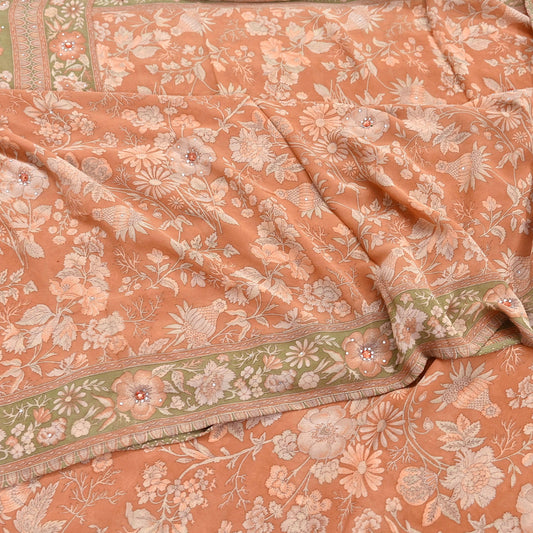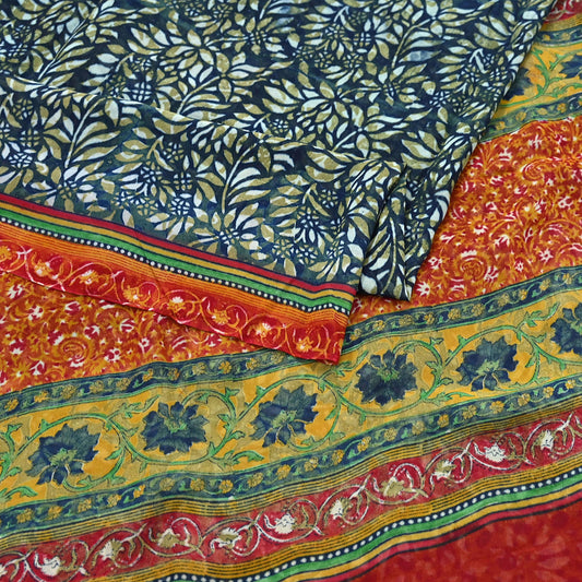 Indian Vintage Orange & Green Saree 100% Pure Georgette Silk Printed Sari Sewing 5yd Craft Fabric Dress Designing for Dress making