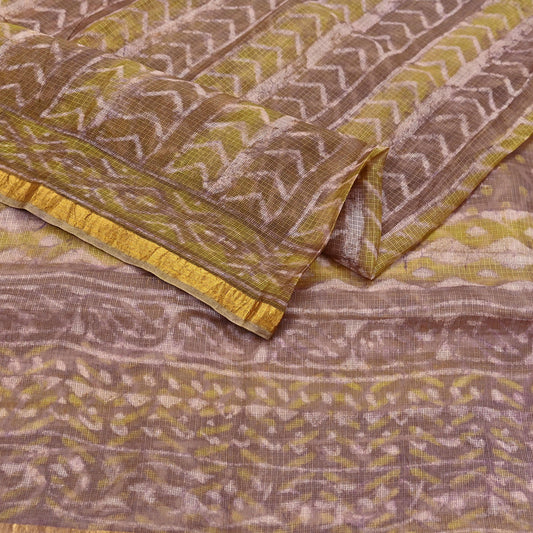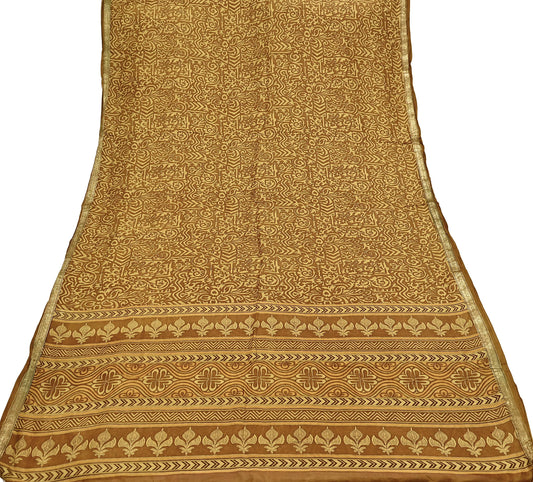 Indian Vintage Sari Brown beige chanderi Silk block Printed Saree 5Yd Fabric Floral Soft Zari Border Ethnic Upcycle Crafting Dress making