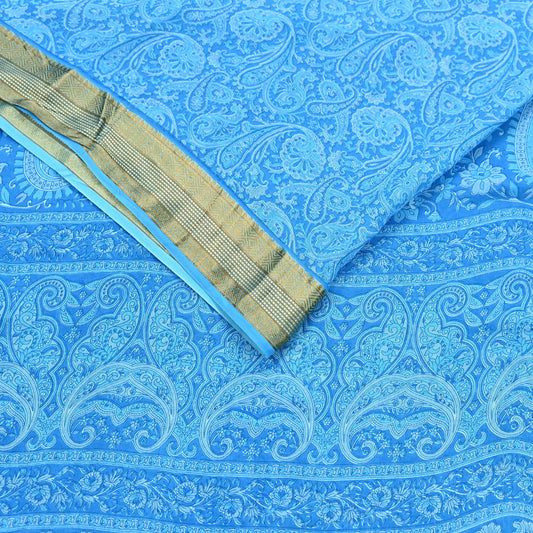 Women Vintage Sari Blue & ivory Pure Georgette Silk Digital Printed Saree Craft Fabric Sewing 5Yd Light Dress Making Geometric Crafting