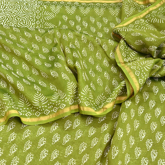 Indian Vintage Sari Green chanderi Silk Bagru Printed Saree 5Yd Fabric Floral Soft Zari Border Ethnic Upcycle Crafting Dress making