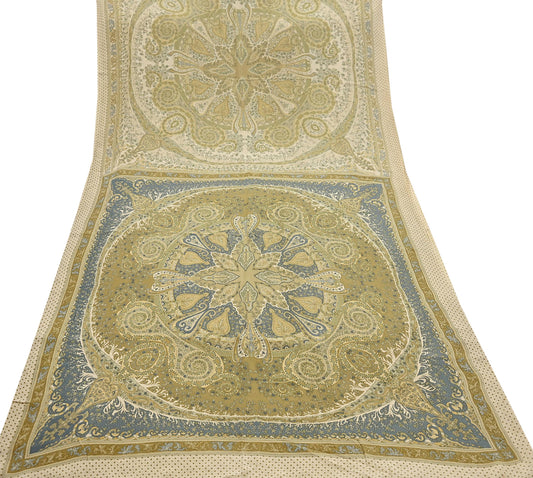 Indian Vintage Sari Ivory & Beige Pure Silk Printed Saree 6yd Sewing Paisley Craft Fabric DressMaking Soft Used Upcycled