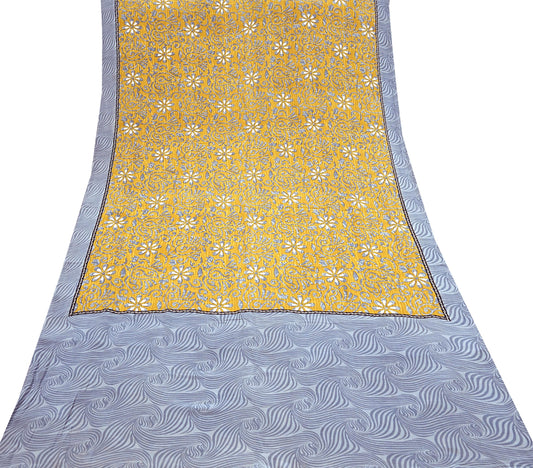 Indian Vintage Sari Gray & Mustard Pure Crepe Silk Printed Sarees 5yd Sewing Soft Craft Fabric Wrap Dress Making Crafting Quilting Upcycle