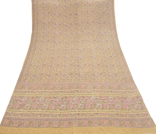 Indian Vintage Sari Beige Pure Crepe Silk Block Printed Sarees 5yd Sewing Floral Soft Craft Fabric Wrap Dress making Upcycle Crafting